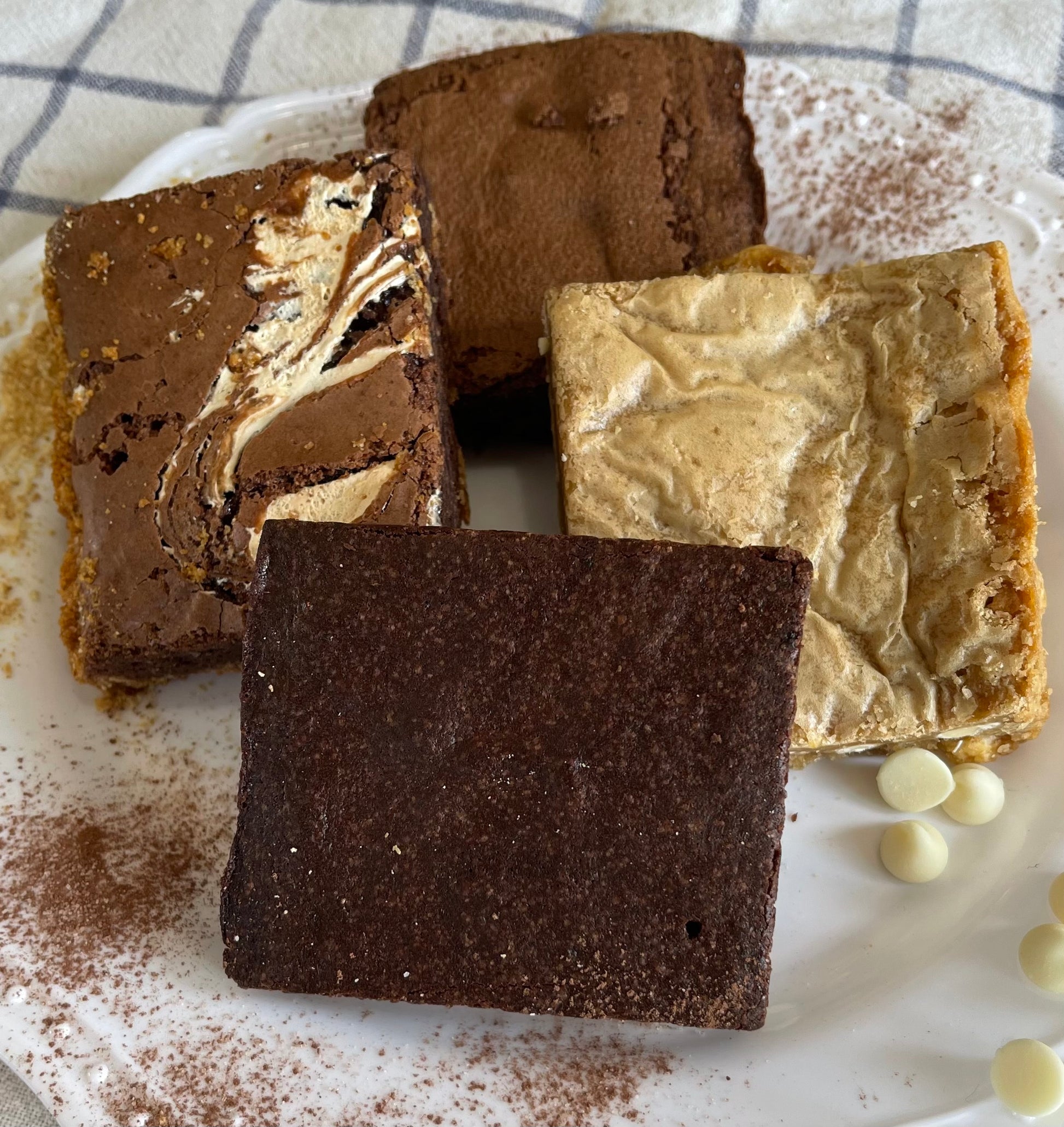 - 4 of our house-made brownies*: (we pick a variety from our customers favorites like: smores, mocha, blondies, and fudgy brownies)